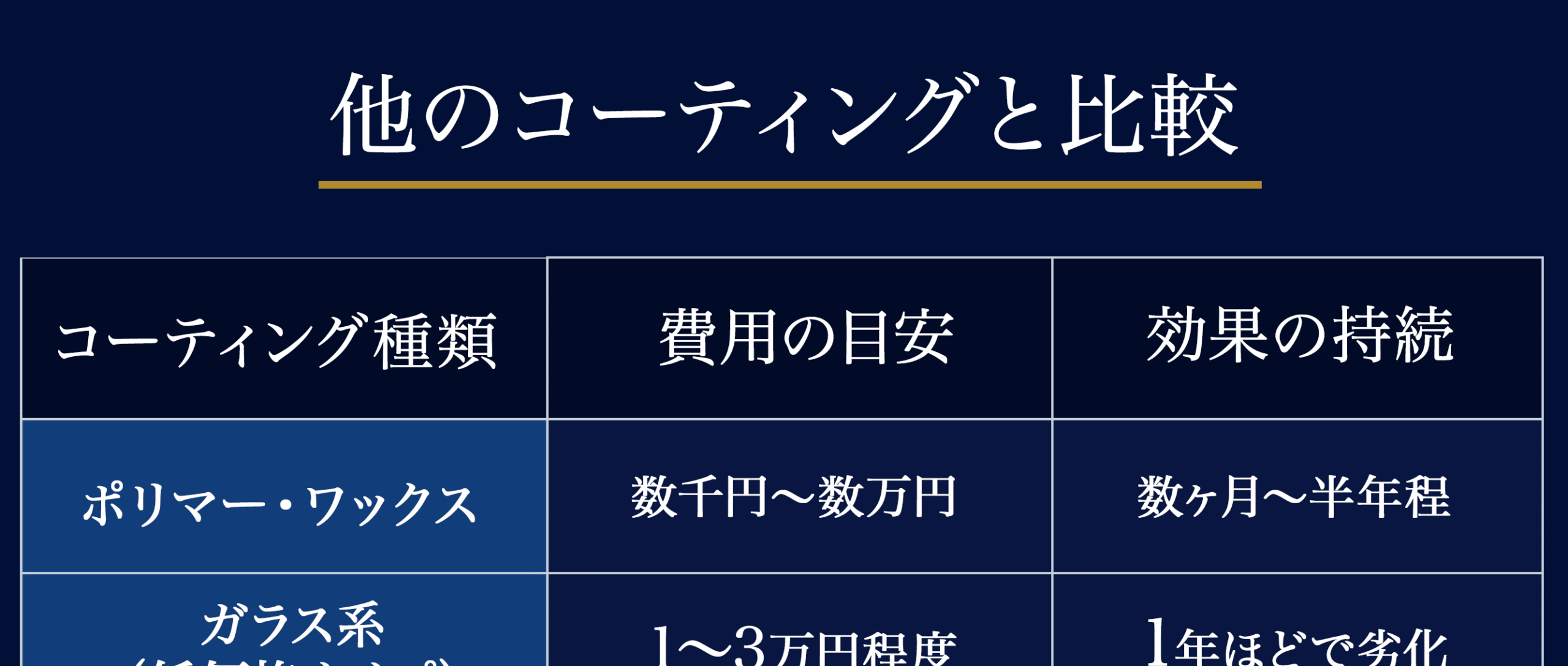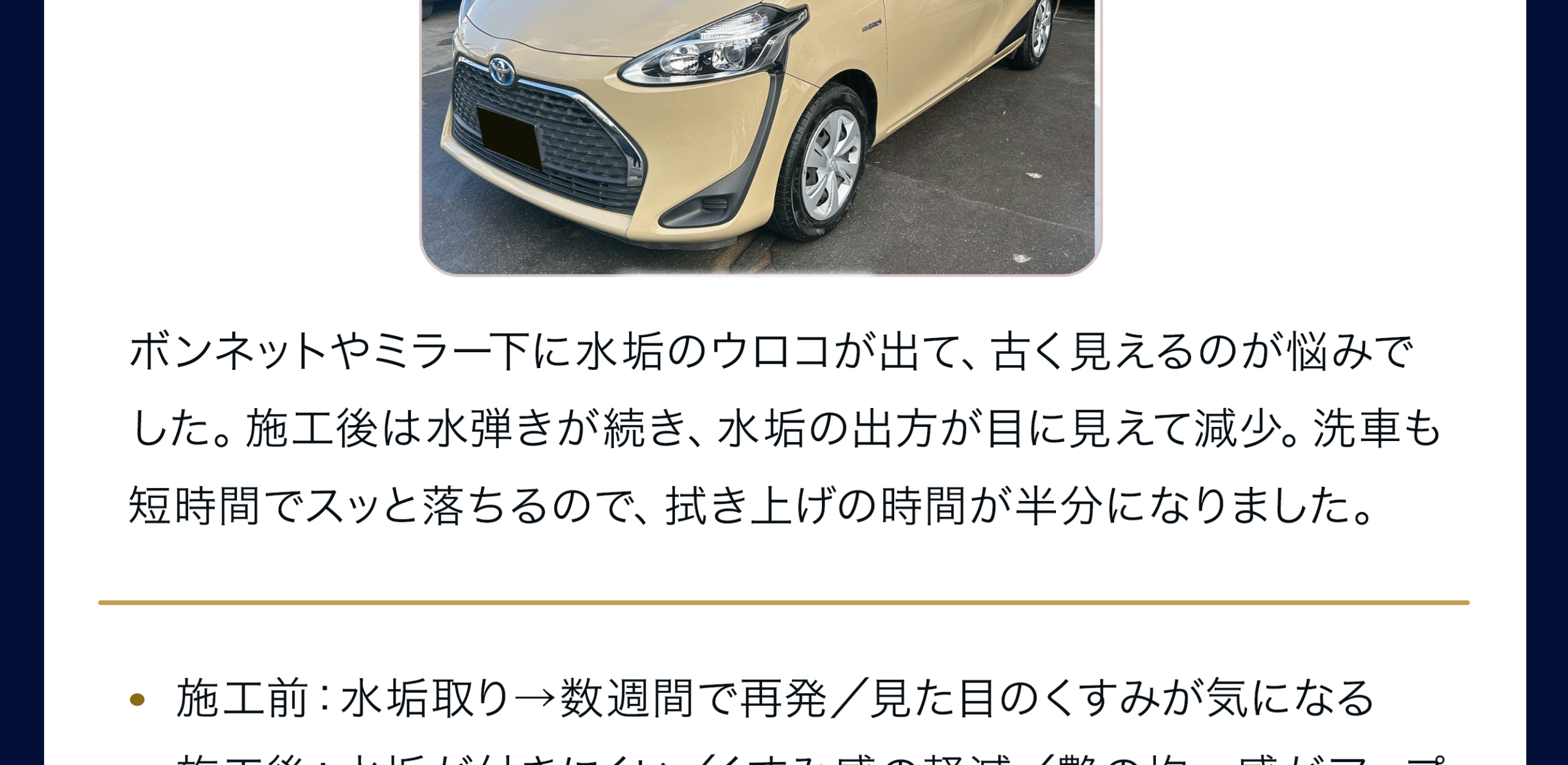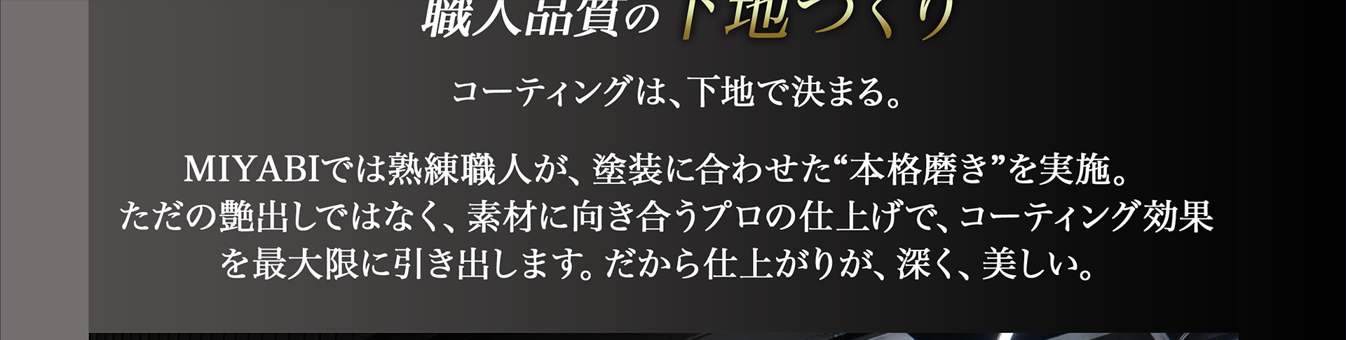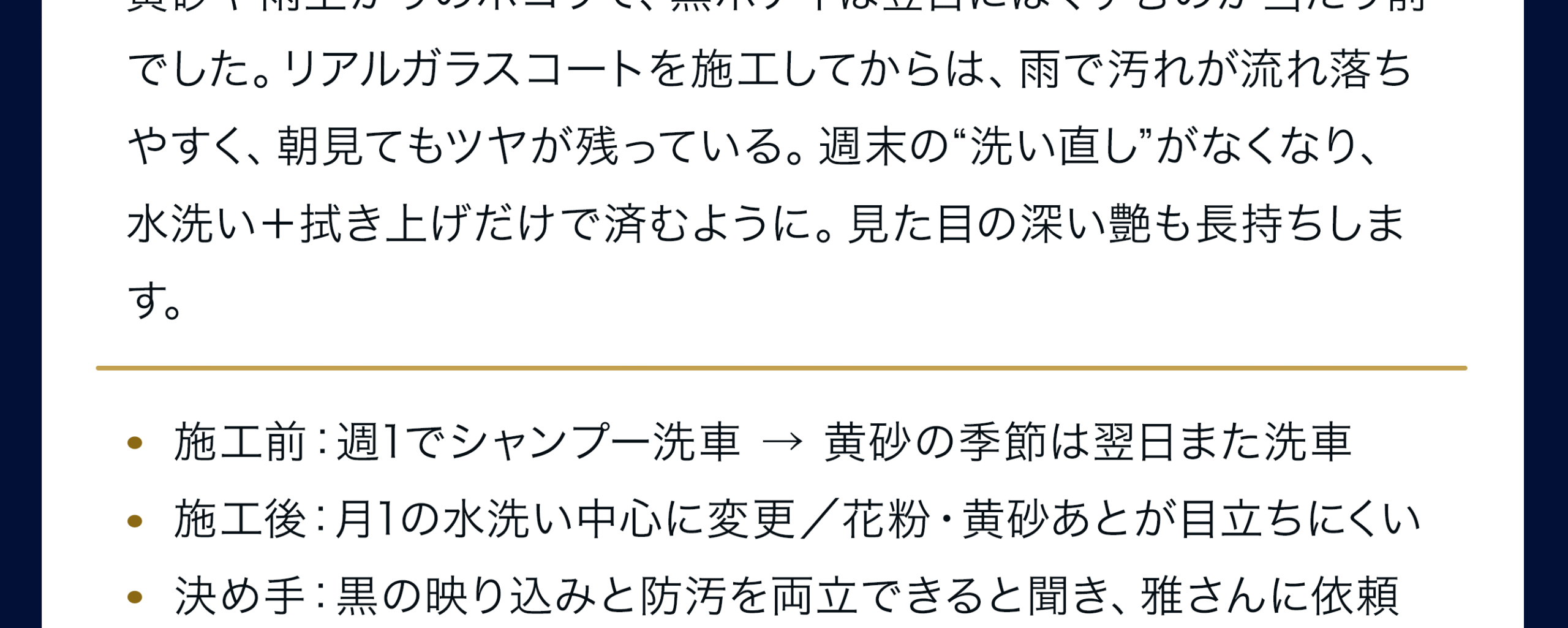 下地研磨で微細キズとくすみを整えた上でガラス被膜を形成するため、汚れが付きにくく、雨で汚れが流れ落ちやすくなります。黒特有の「くすみ戻り」も抑制できます。