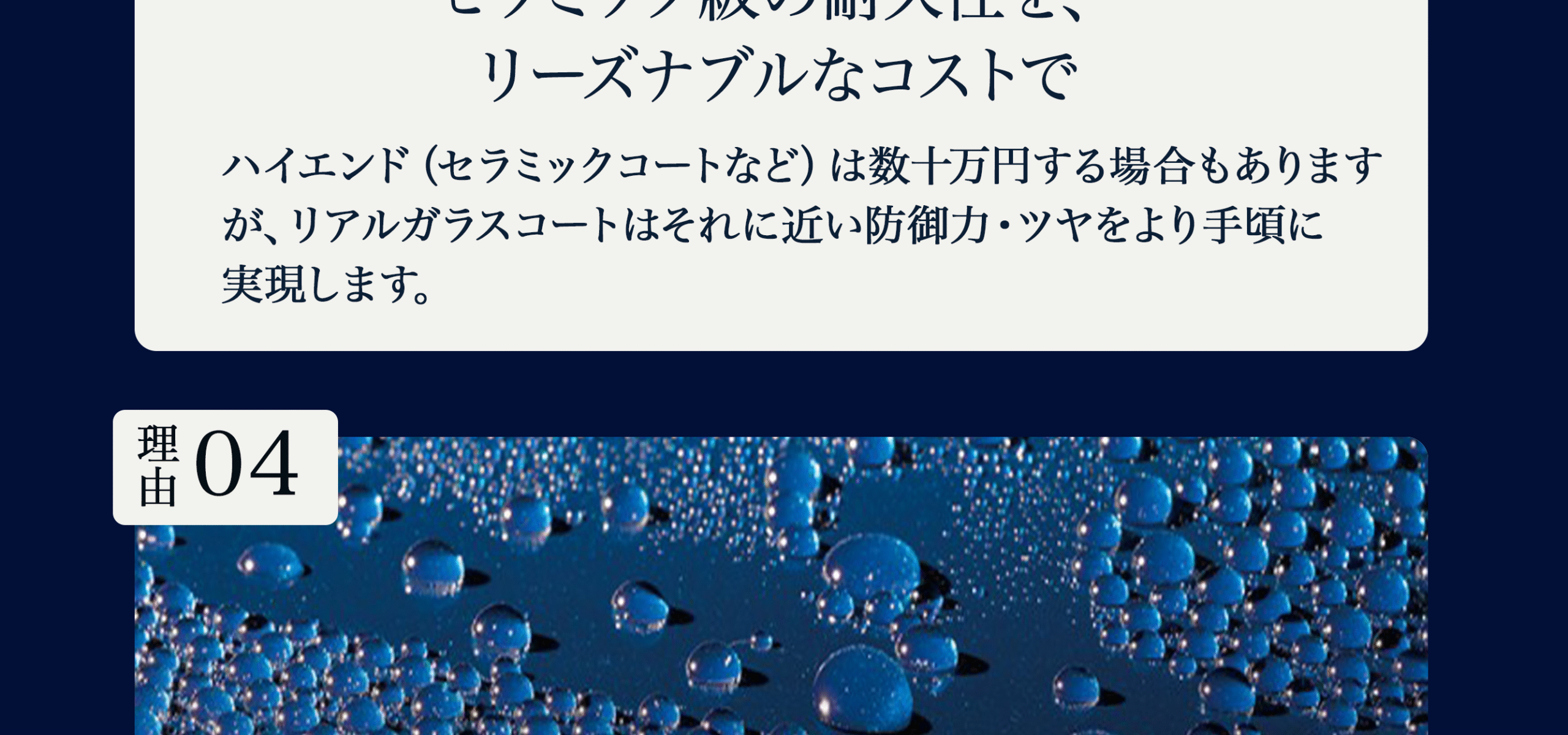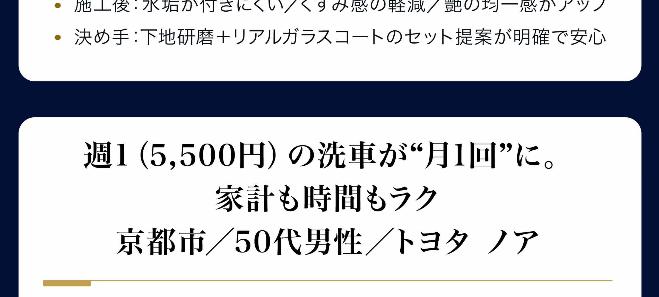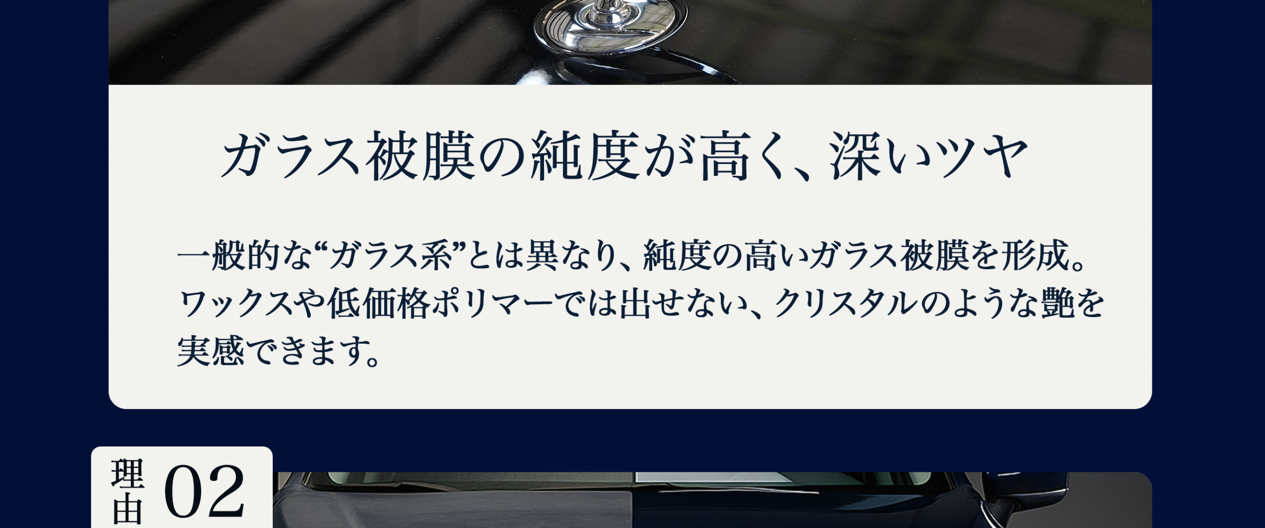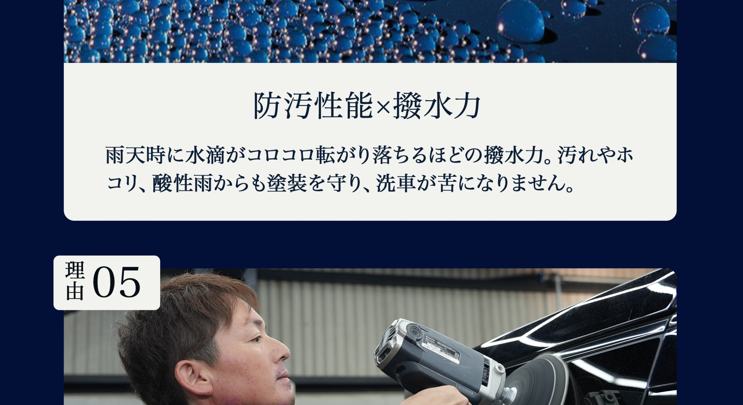 下地研磨で微細キズとくすみを整えた上でガラス被膜を形成するため、汚れが付きにくく、雨で汚れが流れ落ちやすくなります。黒特有の「くすみ戻り」も抑制できます。