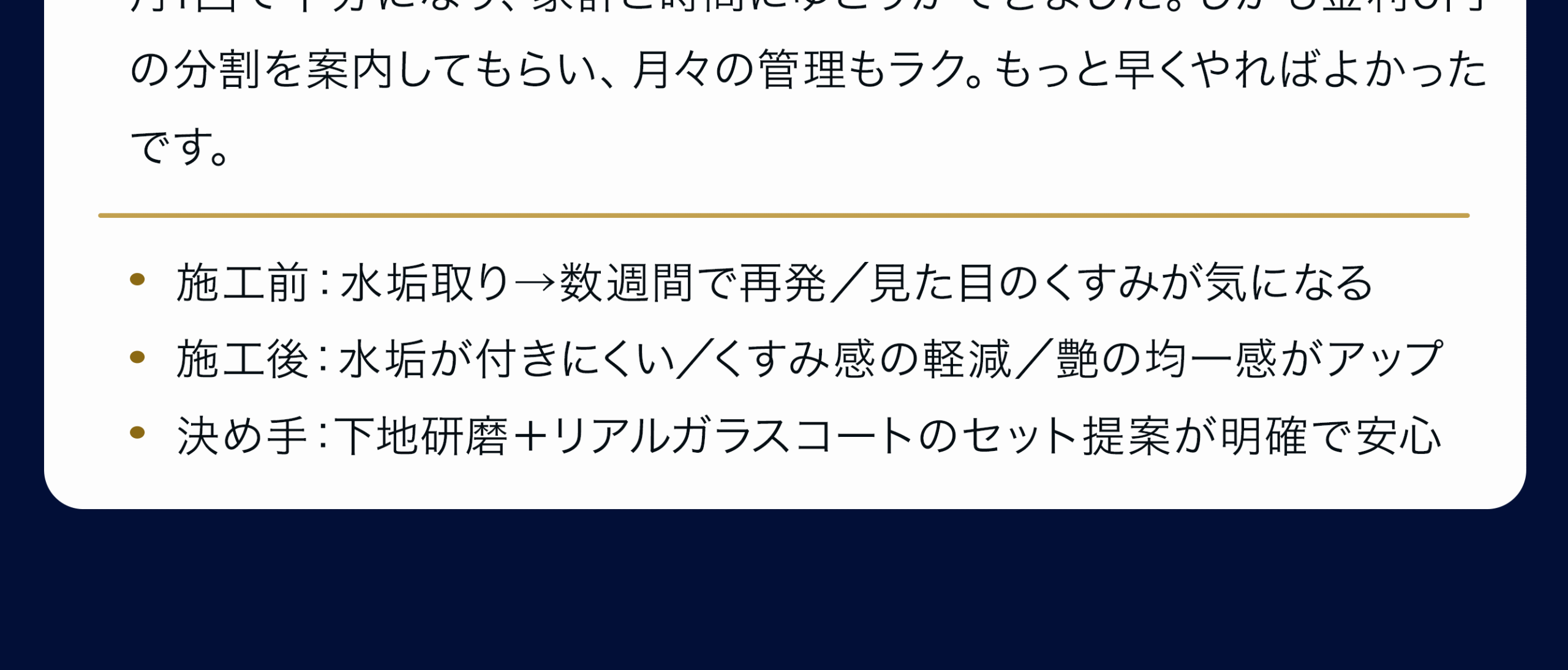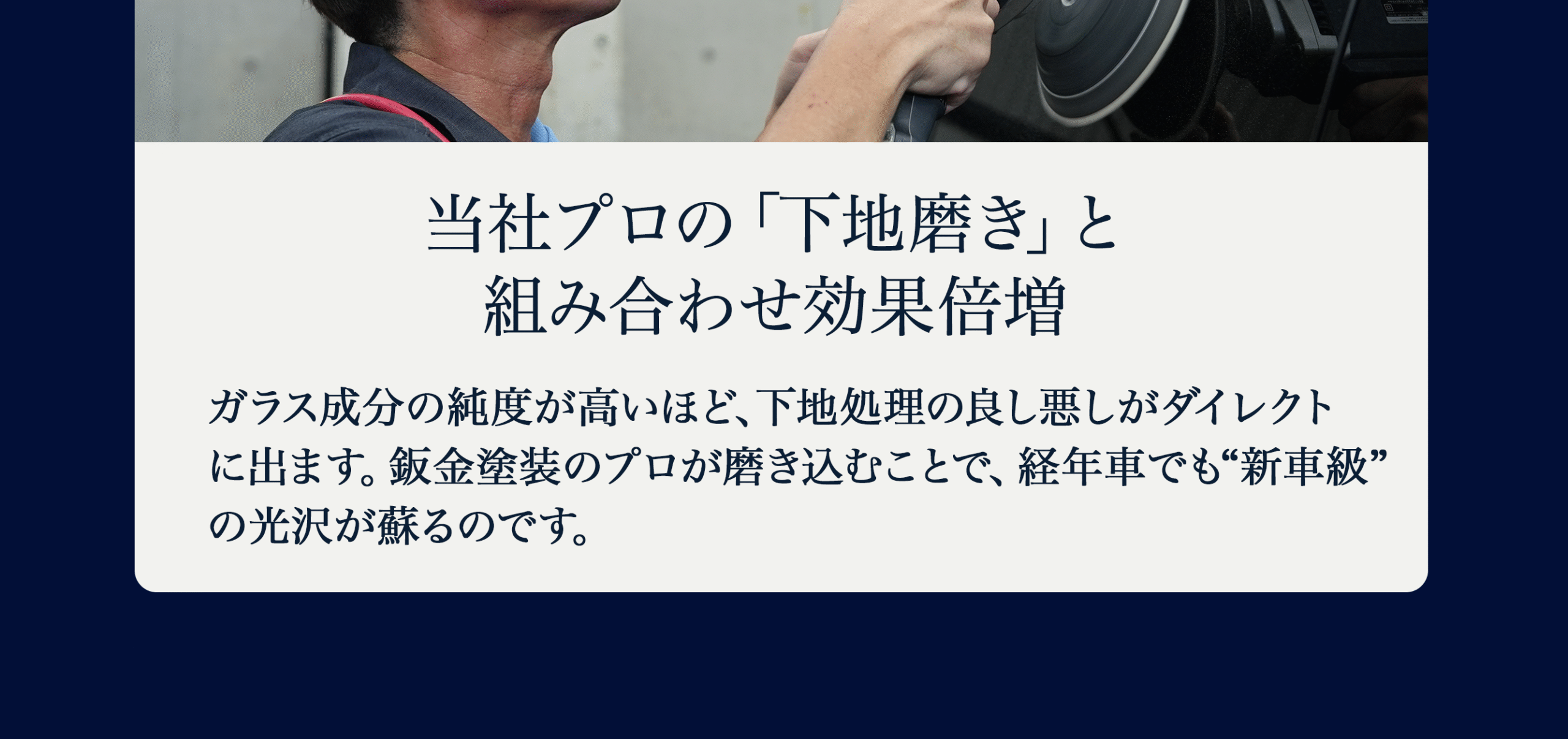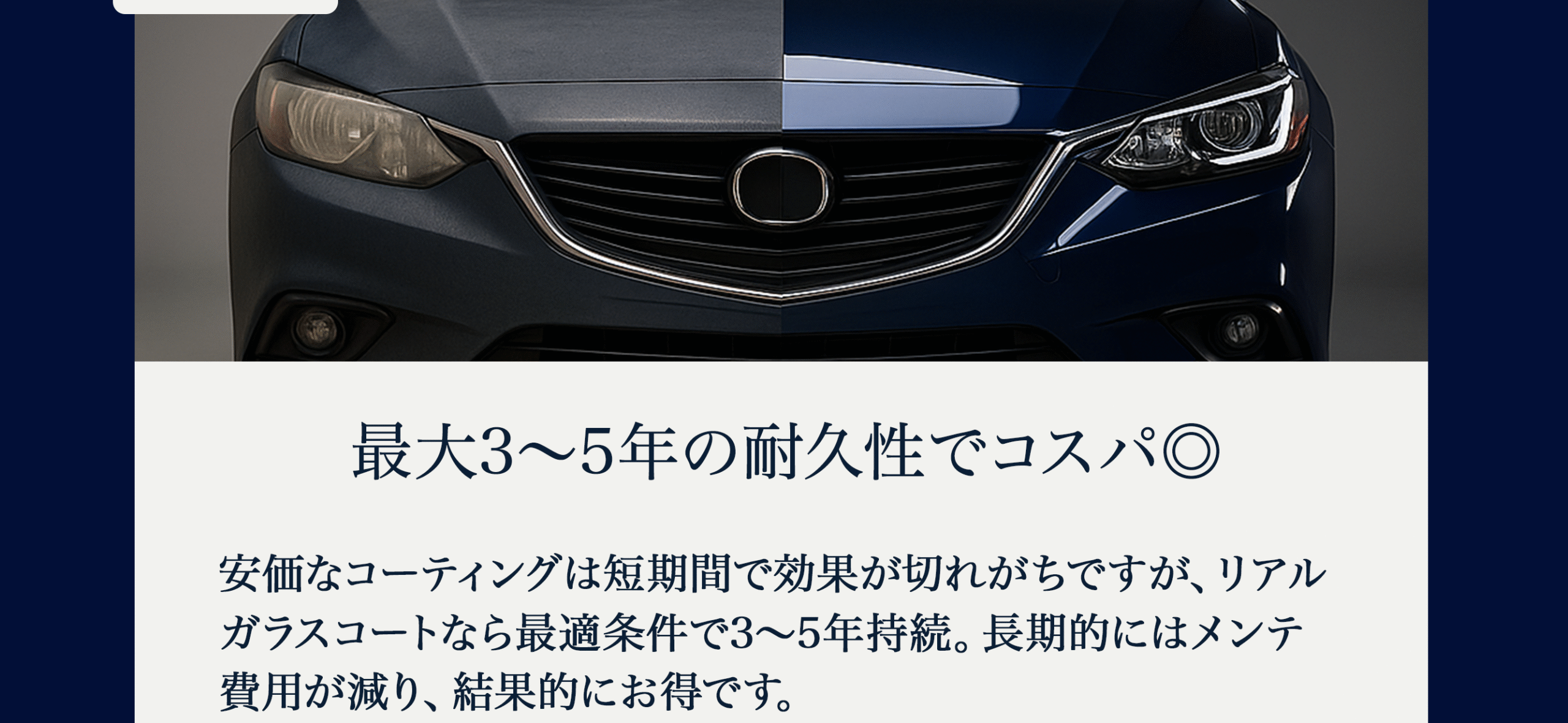 はい。下地研磨 → リアルガラスコートで、くすみ・洗車キズ・水垢の目立ちを抑え、艶・映り込みを大きく向上させます。年式や塗装状態に合わせて研磨強度を調整します(深い傷・クリア層欠損は残る場合あり)。
